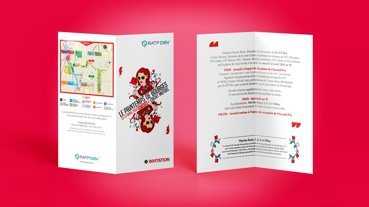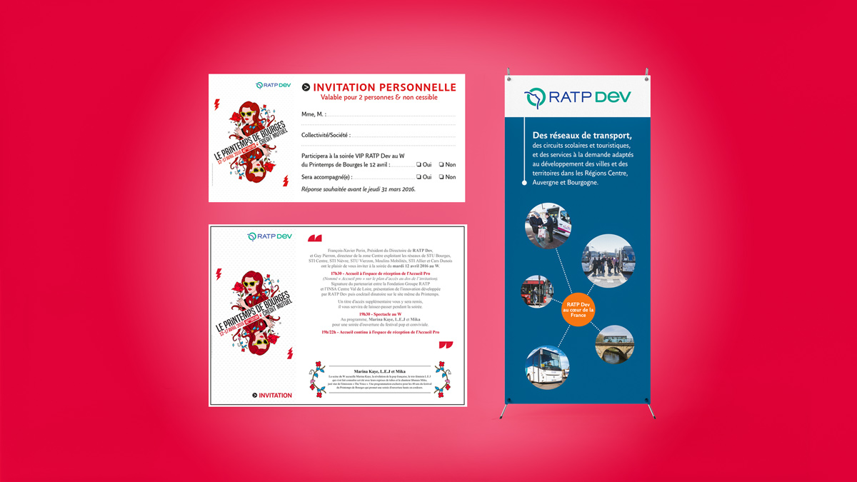 Intervention : adaptation du visuel du Printemps de Bourges dans les gabarits d’invitation print et mail de RATP Dev. Intégration de l’affiche officielle en couverture, reprise des éléments graphiques pour l’intérieur et mise en page complète selon la charte existante. Création d’un kakémono destiné au stand RATP Dev présent sur le festival. Préparation des fichiers pour impression et gestion des corrections.