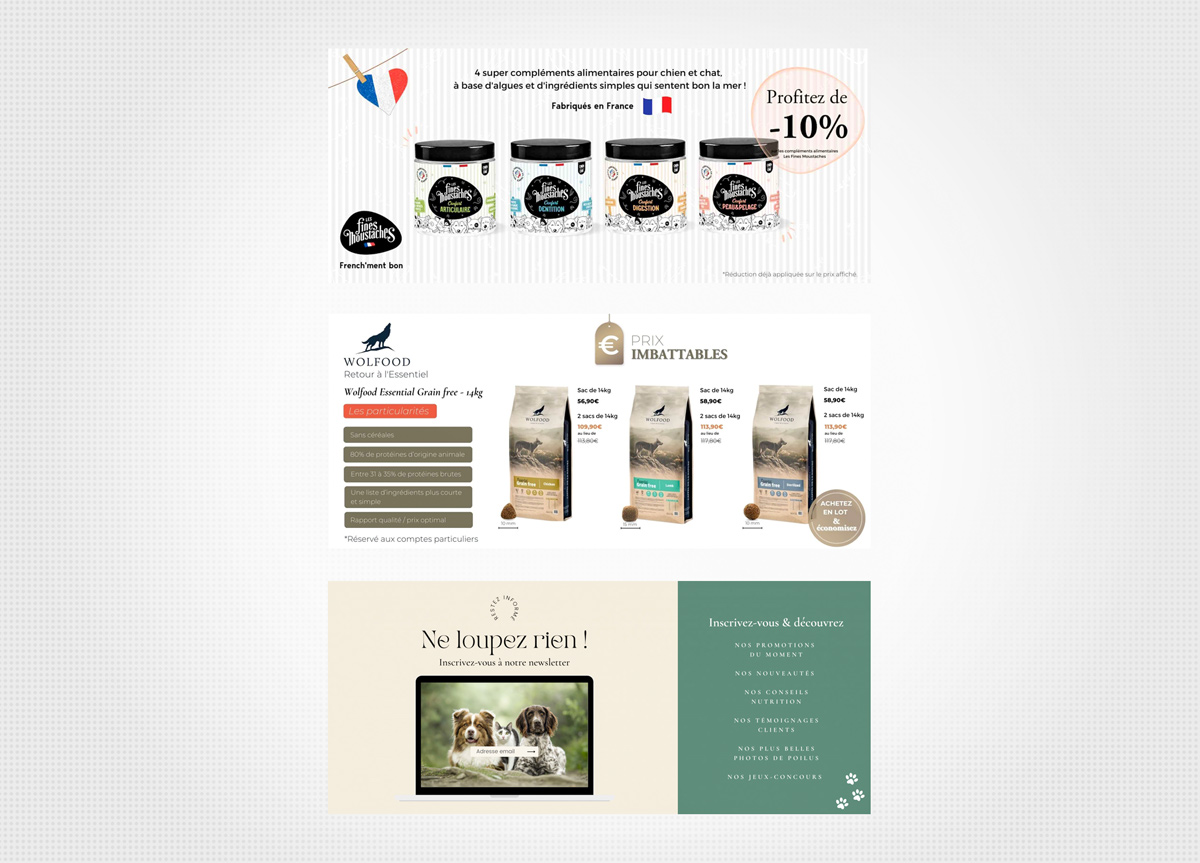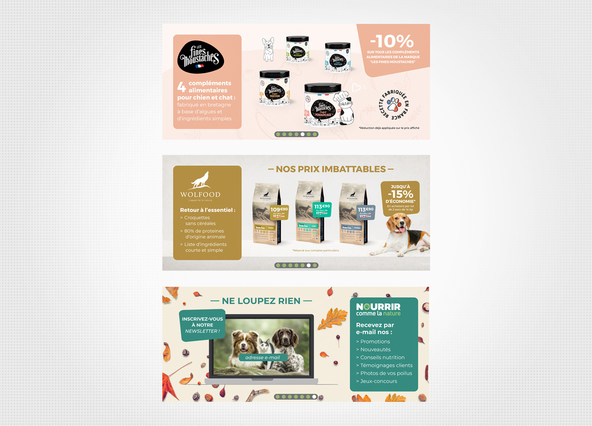 Intervention : création d’un principe de trois gabarits modulables permettant à l’équipe interne de décliner rapidement leurs bannières. Pilotage de la mise en avant des produits, des pastilles prix et des zones promotionnelles pour garantir lisibilité, cohérence graphique et efficacité commerciale. Préparation des fichiers sources et accompagnement à la prise en main.